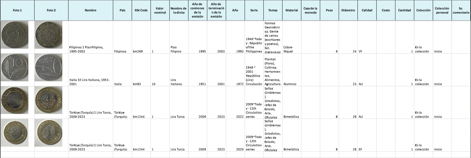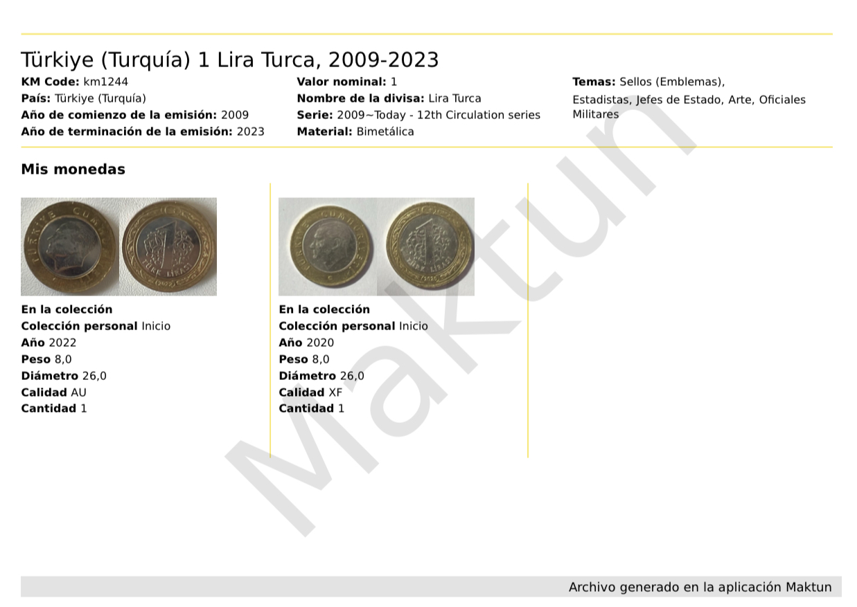 Exporte su colección en cómodos formatos como PDF, XLS o CSV. Guarde su valiosa información sobre monedas y billetes en su dispositivo o simplemente envíela por correo electrónico.